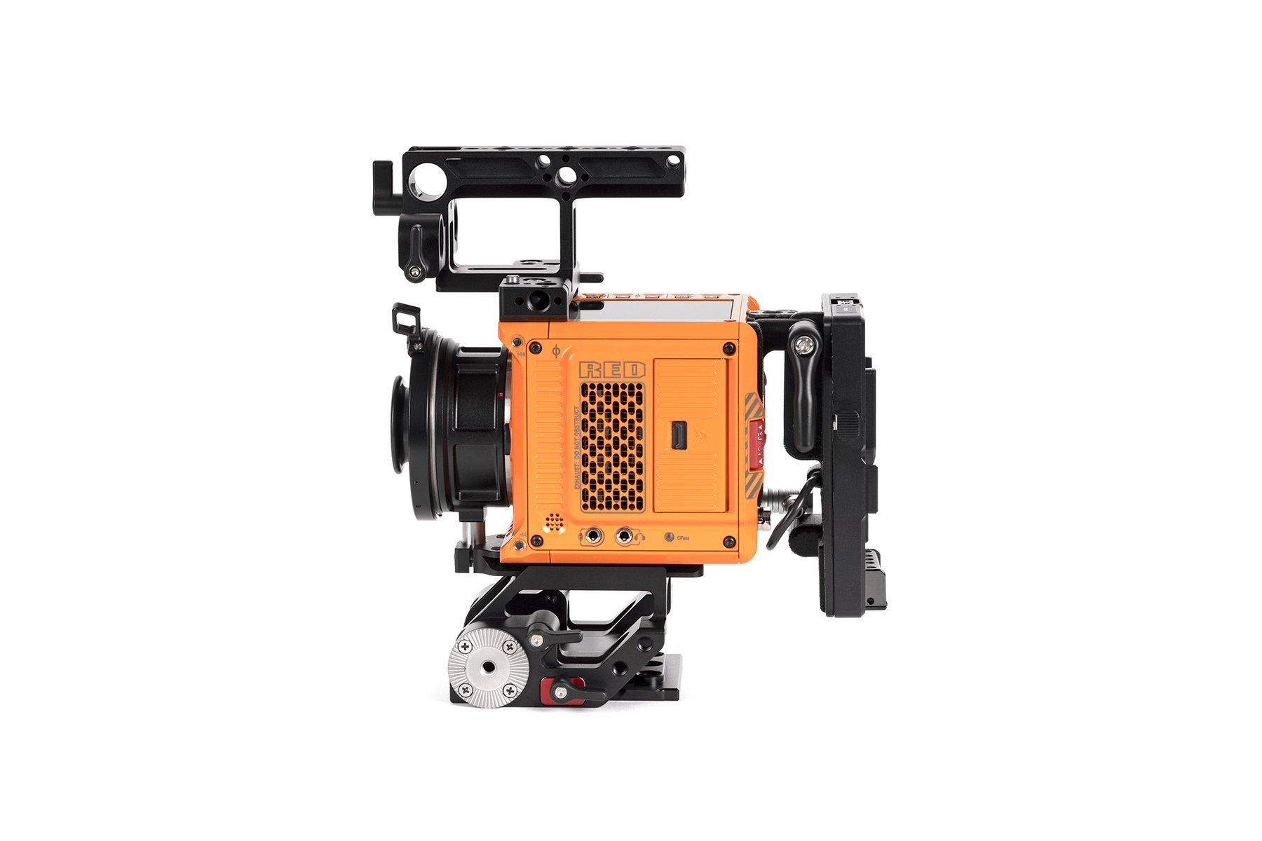 El adaptador batería BP a V-Mount RED KOMODO se conecta a la ranura de la batería BP-9 izquierda de la cámara y alimenta la cámara mediante un conector compatible con LEMO en ángulo recto. El tornillo de mariposa se puede aflojar para inclinar y deslizar la placa según sea necesario.